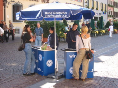Viele Menschen sind sich nicht darüber im Klaren, dass sie durch ihr unüberlegtes Handeln indirekt für millionenfaches Tierleid mit verantwortlich sind. An unseren Info-Ständen beraten wir den Verbraucher u.a. ausführlich über die Themen:
