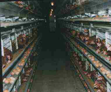 Die weiblichen Tiere kommen in Aufzuchtbetriebe. Hier wird ihnen in den ersten Lebenstagen bei vollem Bewusstsein mit einem heißen Messer der Schnabel gekürzt, um Federpicken und Kannibalismus zu verhindern. Wenn die Tiere 20 –22 Wochen alt sind, werden sie in die Käfige gesperrt. Ein solcher Käfig misst 50 X 50 cm und hat vorn eine Höhe von 40 cm, hinten 35 cm. Einer Legehenne stehen hier 550 qcm Fläche zur Verfügung. Die Tiere stehen auf einem schrägen Drahtgitterboden, damit die Eier auf ein Förderband rollen können. Es gibt keine Sitzstangen, keine Einstreu und keine Nester bzw. Nistmaterial. Teilweise ist es den Hennen nicht einmal möglich aufrecht zu stehen.